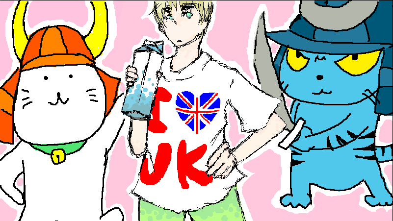 左から猫、ネコ、猫。って感じで。嘘です。ただ単にひこにゃんとしまさこにゃんを描いて欲しかっただけです。ってこっちの方が言い訳っぽく聞こえるのは何でかなー。ちなみに左の方がひこにゃんで、右の方がしまさこにゃんです。真ん中のダサい格好してるのは意外なことにイギリスです(苦笑)。一番頑張ったのはTシャツのハートの部分です。あーこんなTシャツ欲しいなとか思って描いてました。あ、あとちょっとクールな感じにしようと思って頑張りました。牛乳持たせといてなんですけど。あとしまさこにゃんの刀の柄が白いのは塗り忘れでなく、密曰く「(何色なのか)微妙」らしいです。