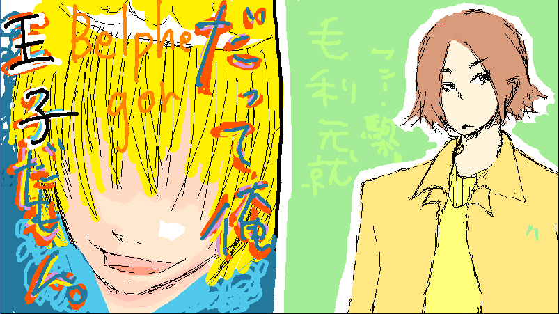 第二ラウンドは密は勝手にベルフェ描くと言い出して(実際私ベルフェ知らんのやけど)、私に好きなの描いていいよって言ったんで「じゃあ、凌統」って言ったら遠まわしに却下されました。その後、打開策として元就といったらあっさり許可されました。